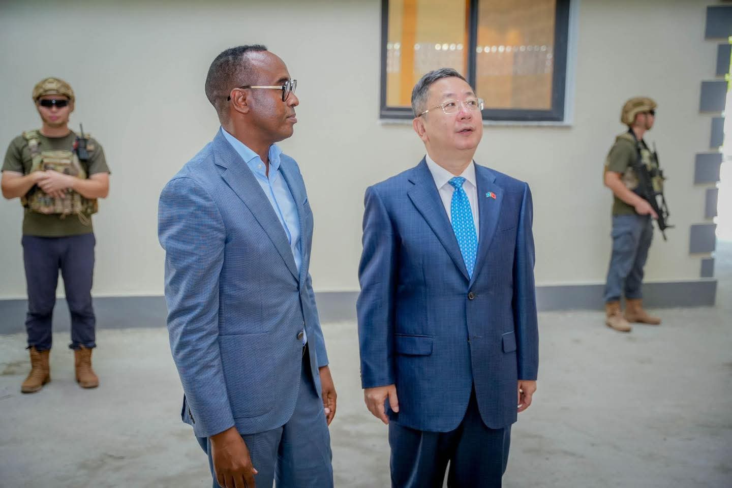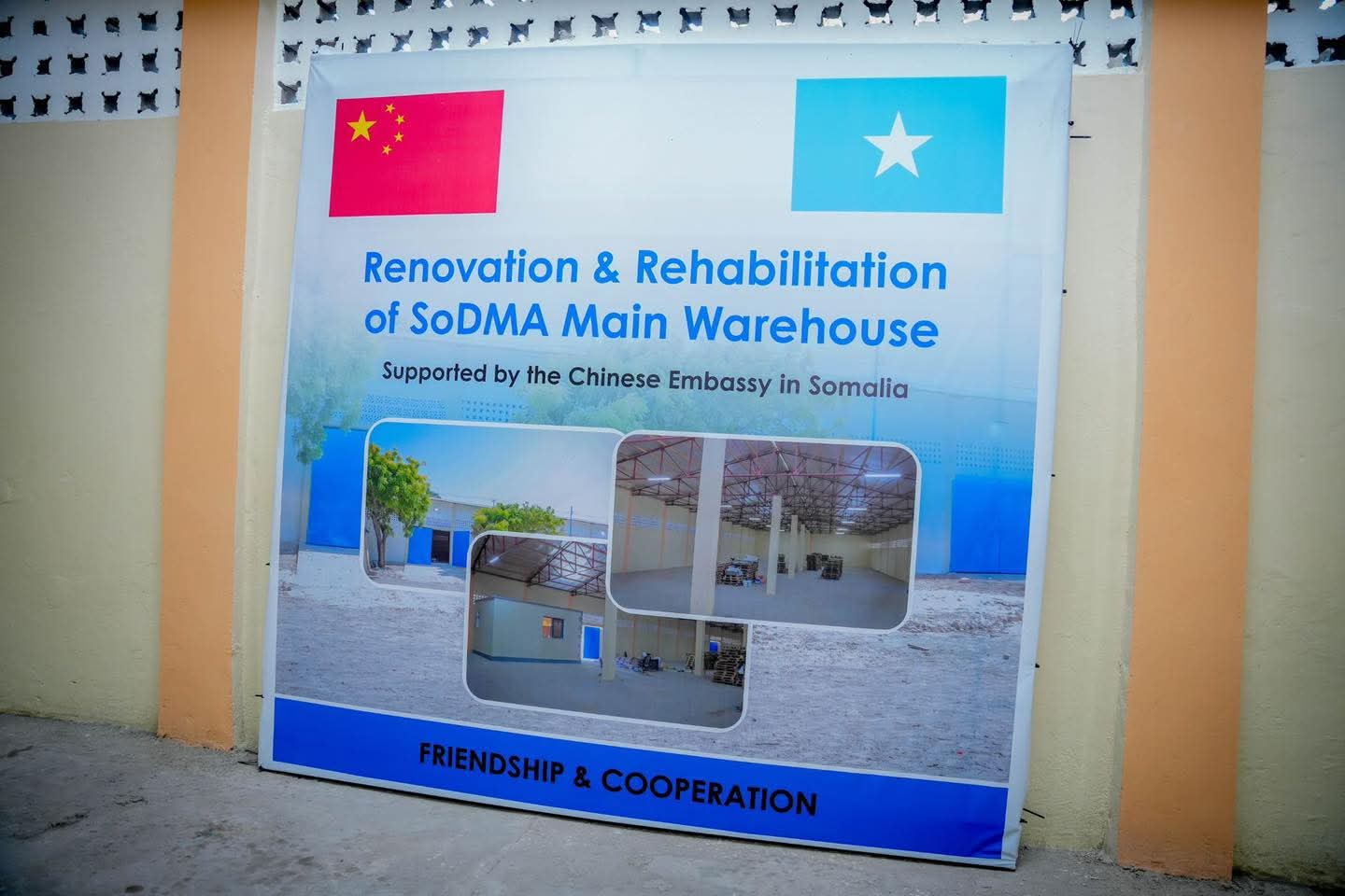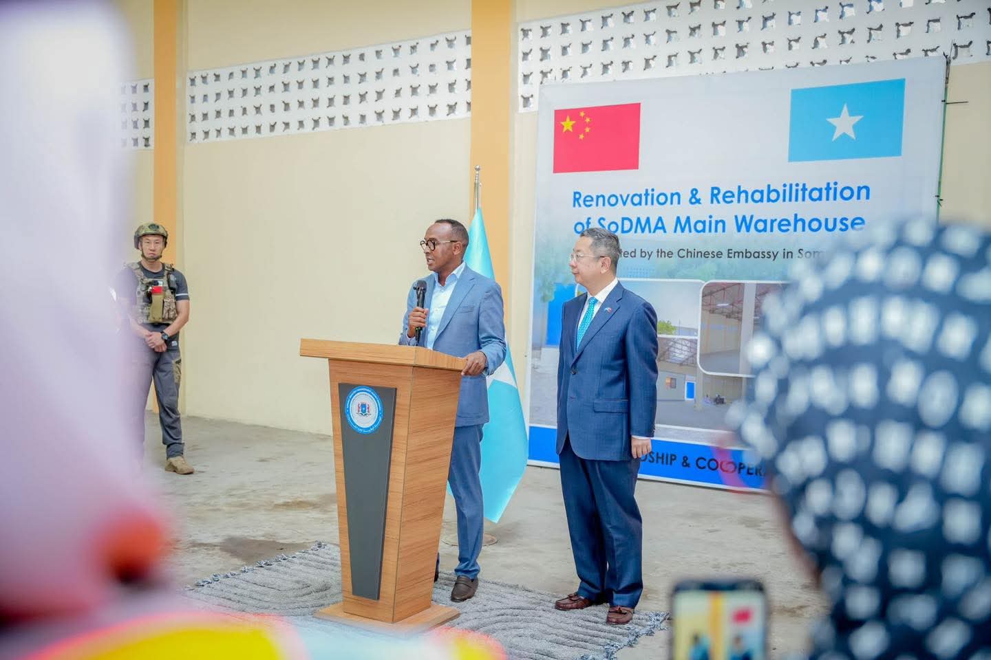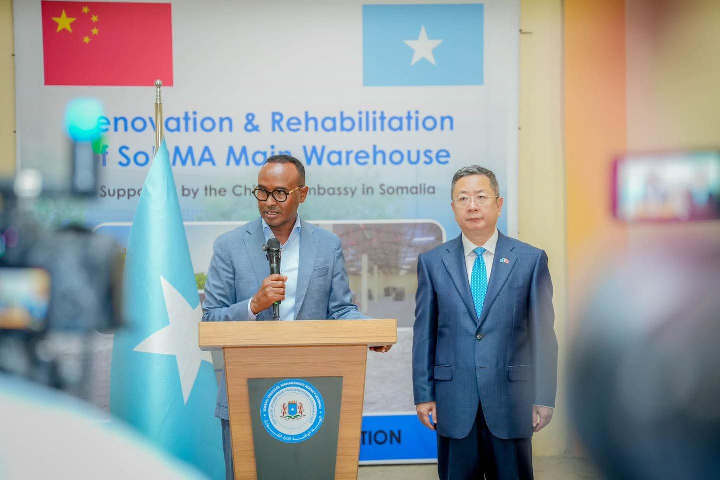 Guddoomiyaha Hayโadda Maareynta Musiibooyinka Qaranka Soomaaliyeed (SoDMA), Mudane Maxamuud Macalin Cabdulle, iyo Safiirka Dowladda Shiinaha ee Soomaaliya, Mudane Wang Yu, ayaa si wadajir ah xarigga uga jaray xarunta keydka cunnada ee SoDMA oo dib-u-dayactir lagu sameeyay, taas oo ay taageertay dhismihiisa Dowladda Shiinaha.