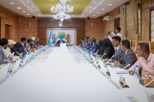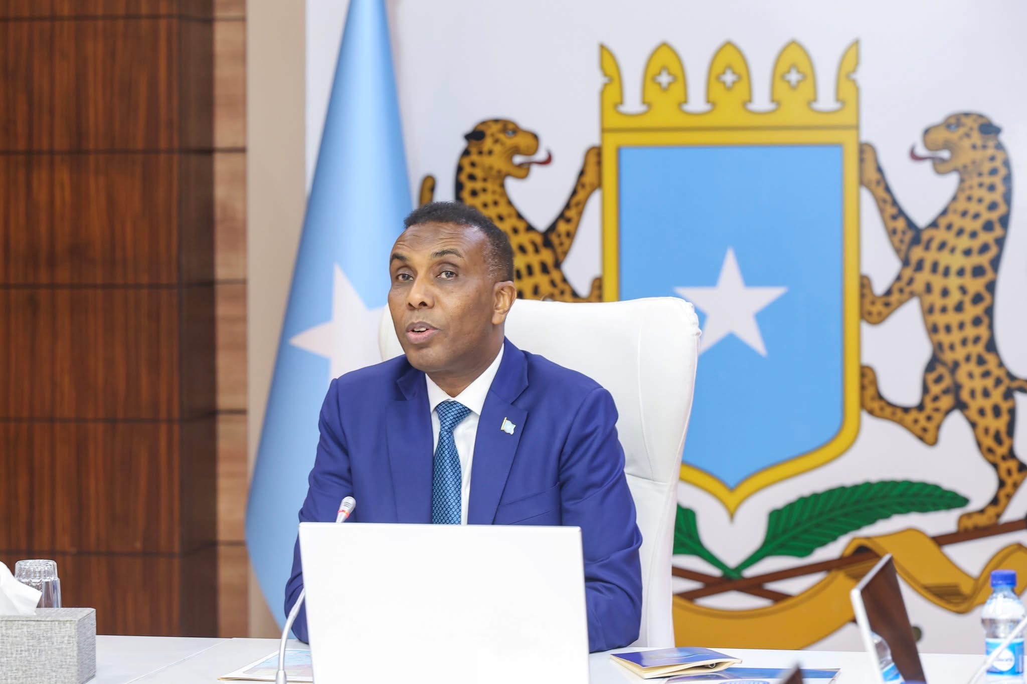 RADIO MUQDISHO:-Wasaaraha Xukuumadda Jamhuuriyadda Federaalka Soomaaliya, Mudane Xamsa Cabdi Barre, ayaa guddoomiyey kulan looga hadlayo soo bandhigidda iyo dardargelinta Biyo-Mareenka magaalada caasimadda ah ee Muqdisho.