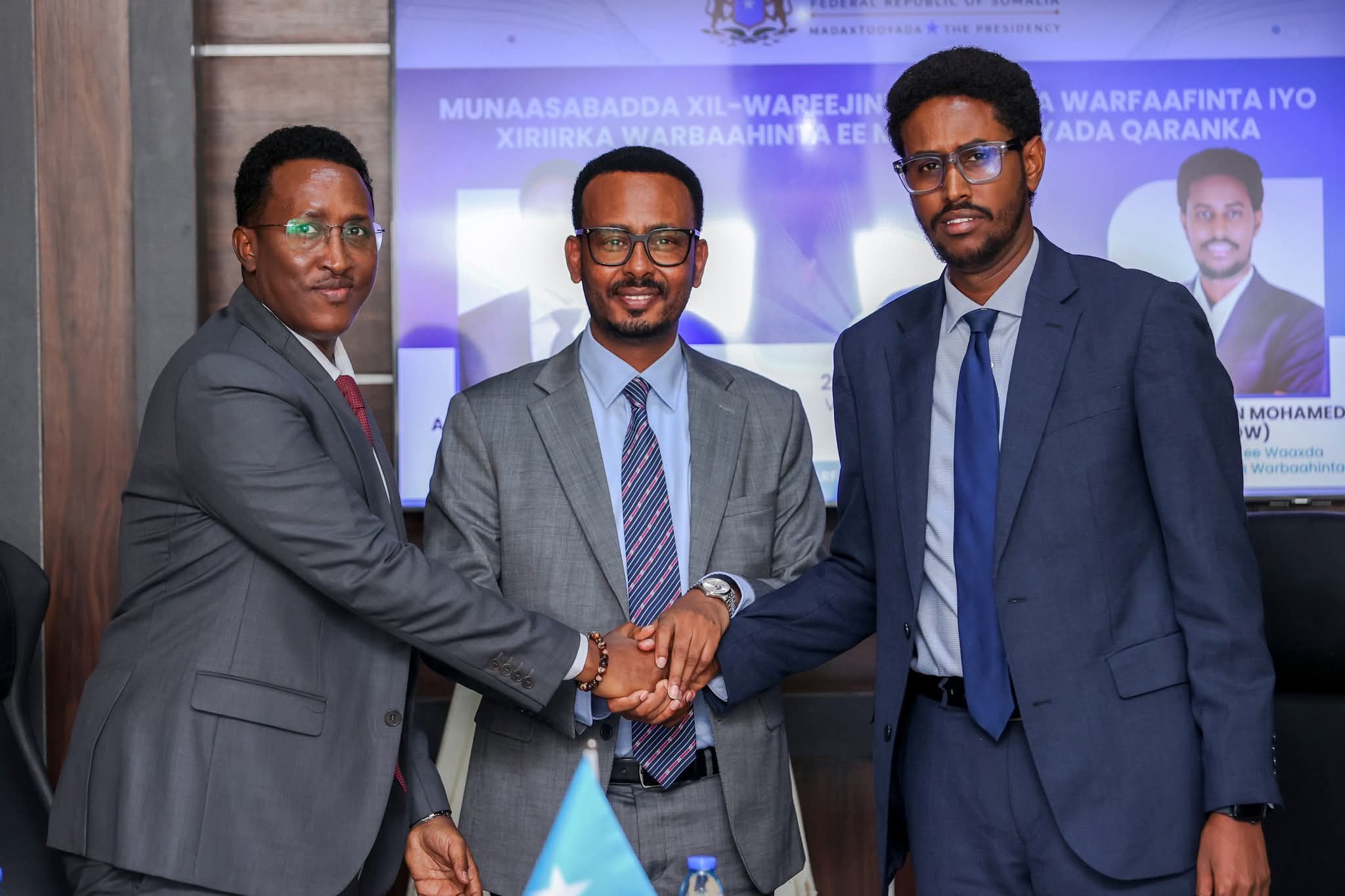 Agaasimaha Guud ee Madaxtooyada Qaranka Mudane Cabdixakiim Maxamed Yuusuf ayaa xilka u kala wareejiyey Agaasimaha cusub ee Waaxda Warfaafinta iyo Xiriirka Warbaahinta Mudane Cabdicasiis Xasan Maxamed (Golfyare) iyo Agaasimihii hore Mudane Maxamed Aadan Maxamed.