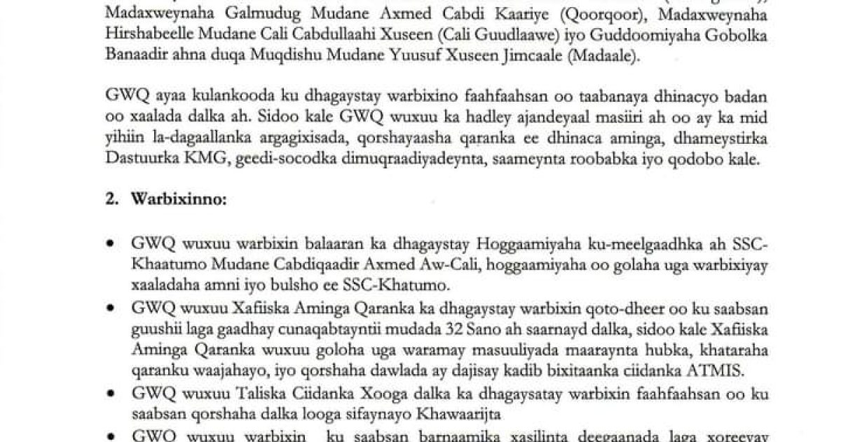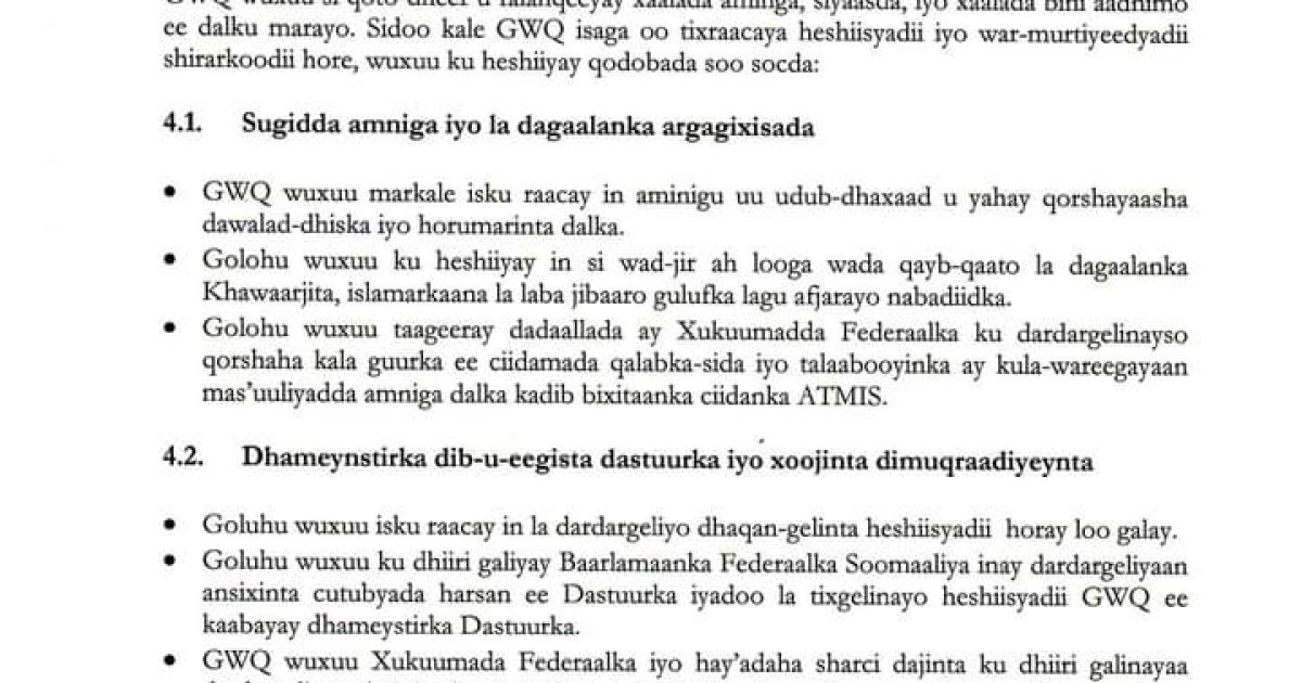 GWQ wuxuu si qoto-dheer u falanqeeyay xaalada aminga, siyaasda, iyo xaalada bini aadnimo ee dalku marayo. Sidoo kale GWQ isaga oo tixraacaya heshiisyadii iyo war-murtiyeedyadii shirarkoodii hore, wuxuu ku heshiiyay qodobada soo socda: