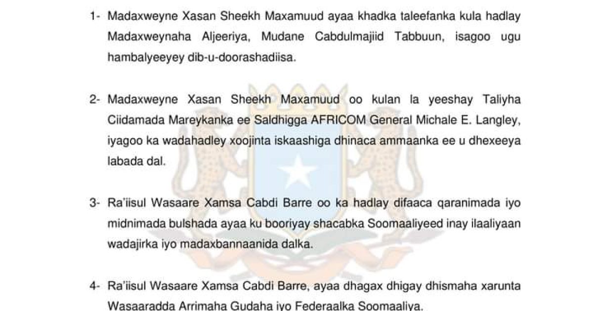 1-Madaxweyne Xasan Sheekh Maxamuud ayaa khadka taleefanka kula hadlay Madaxweynaha Aljeeriya, Mudane Cabdulmajiid Tabbuun, isagoo ugu hambalyeeyey dib-u-doorashadiisa.