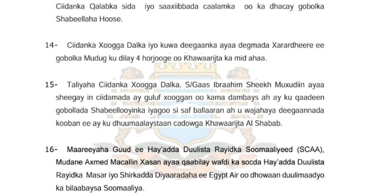 15- Taliyaha Ciidanka Xoogga Dalka, S/Gaas Ibraahim Sheekh Muxudiin ayaa sheegay in ciidamada ay guluf xooggan oo kama dambays ah ay ku qaadeen gobollada Shabeellooyinka iyagoo si saf ballaaran ah u wajahaya deegaannada kooban ee ay ku dhuumaalaystaan cadowga Khawaarijta Al Shabab.