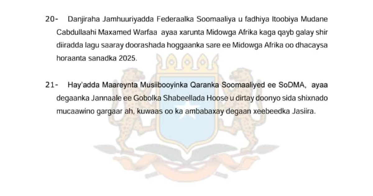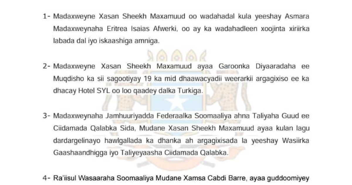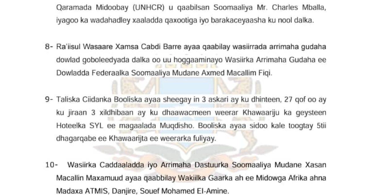 3- Madaxweynaha Jamhuuriyadda Federaalka Soomaaliya ahna Taliyaha Guud ee Ciidamada Qalabka Sida, Mudane Xasan Sheekh Maxamuud ayaa kulan lagu dardargelinayo hawlgallada ka dhanka ah argagixisada la yeeshay Wasiirka Gaashaandhigga iyo Taliyeyaasha Ciidamada Qalabka.