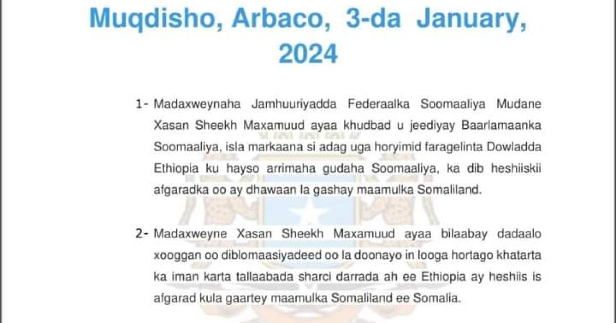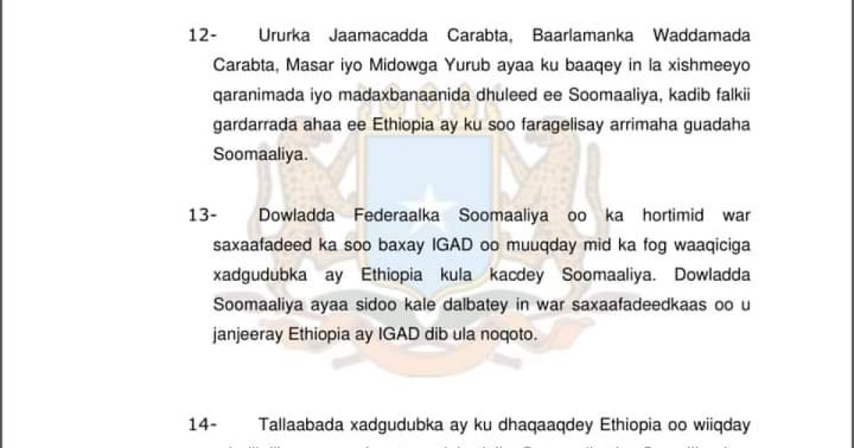 13- Dowladda Federaalka Soomaaliya oo ka hortimid war saxaafadeed ka soo baxay IGAD oo muuqday mid ka fog waaqiciga xadgudubka ay Ethiopia kula kacdey Soomaaliya. Dowladda Soomaaliya ayaa sidoo kale dalbatey in war saxaafadeedkaas oo u janjeeray Ethiopia ay IGAD dib ula noqoto.