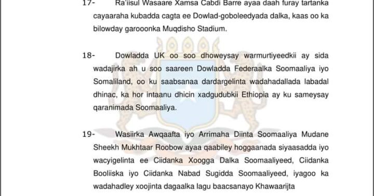 18- Dowladda UK oo soo dhoweysay warmurtiyeedkii ay sida wadajirka ah u soo saareen Dowladda Federaalka Soomaaliya iyo Somaliland, oo ku saabsanaa dardargelinta wadahadallada labadal dhinac, ka hor intaanu dhicin xadgudubkii Ethiopia ay ku sameysay qaranimada Soomaaliya.
