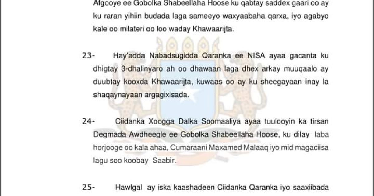 23- Hay’adda Nabadsugidda Qaranka ee NISA ayaa gacanta ku dhigtay 3-dhalinyaro ah oo dhawaan laga dhex arkay muuqaalo ay duubtay kooxda Khawaarijta, kuwaas oo ay ku sheegayaan inay la shaqaynayaan argagixisada.