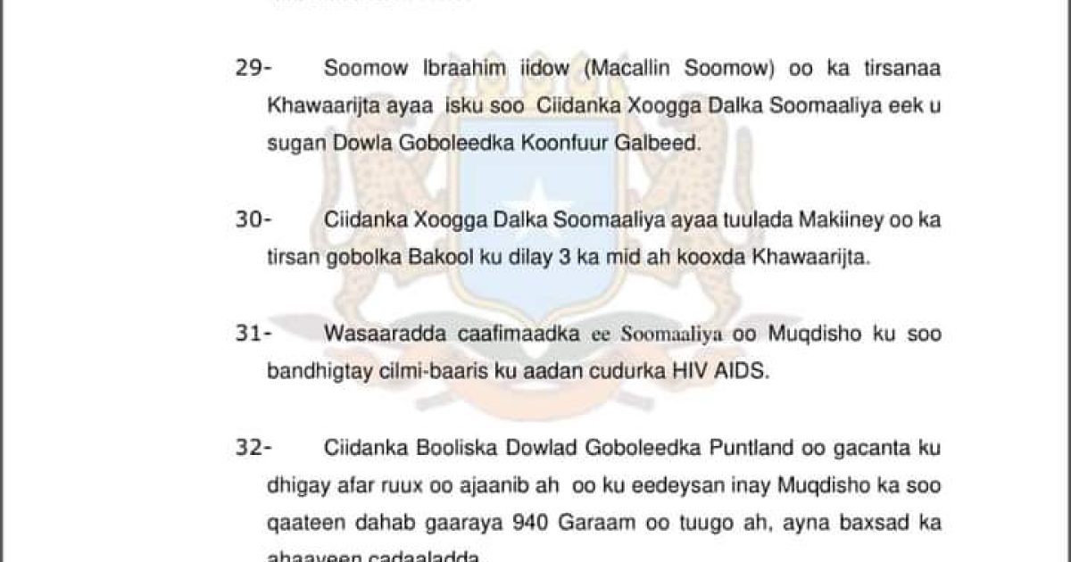 32- Ciidanka Booliska Dowlad Goboleedka Puntland oo gacanta ku dhigay afar ruux oo ajaanib ah oo ku eedeysan inay Muqdisho ka soo qaateen dahab gaaraya 940 Garaam oo tuugo ah, ayna baxsad ka ahaayeen cadaaladda.