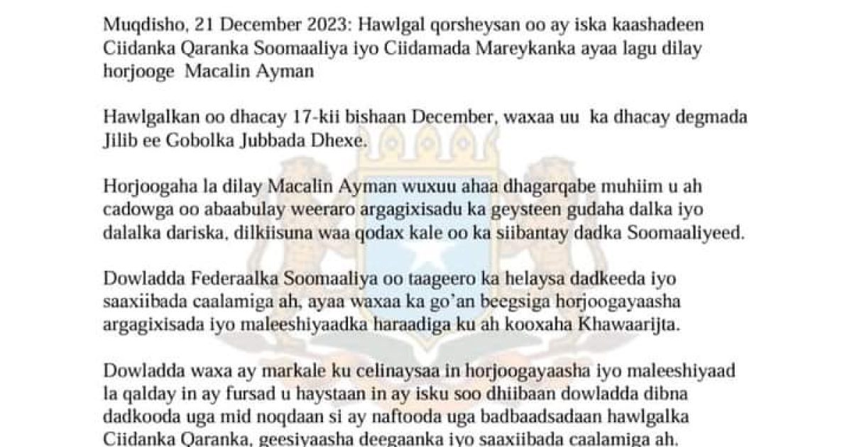 14- Ciidanka Xoogga Dalka oo kaashanaya Ciidamada Mareykanka ayaa weerar ay ka fuliyeen degmada Jilib ee Gobolka Jubbada Dhexe waxa ay ku dileen mid ka mid ah horjoogeyaasha sare ee Khawaarijta Al Shabab oo magaciisa la yiraahdo Macalim Ayman.