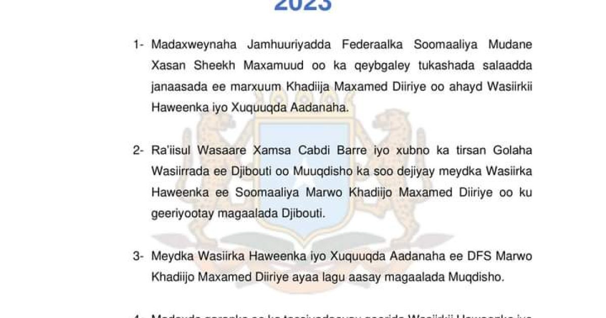 4- Madaxda qaranka oo ka tacsiyadeeyay geerida Wasiirkii Haweenka iyo Xuquuqda Aadanaha Marwo Khadiijo Maxamed Diiriye.
