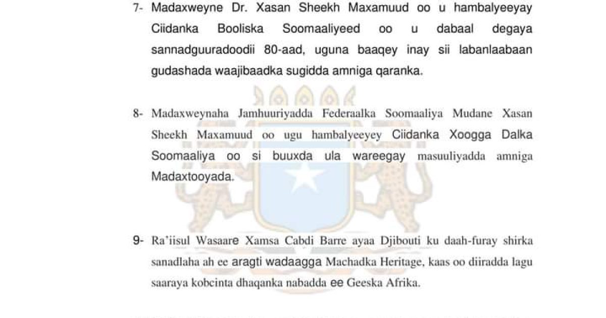 8- Madaxweynaha Jamhuuriyadda Federaalka Soomaaliya Mudane Xasan Sheekh Maxamuud oo ugu hambalyeeyey Ciidanka Xoogga Dalka Soomaaliya oo si buuxda ula wareegay masuuliyadda amniga Madaxtooyada.