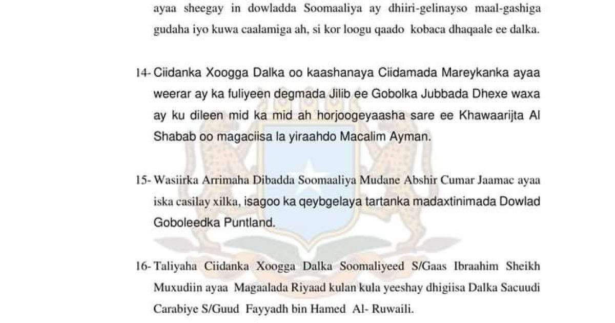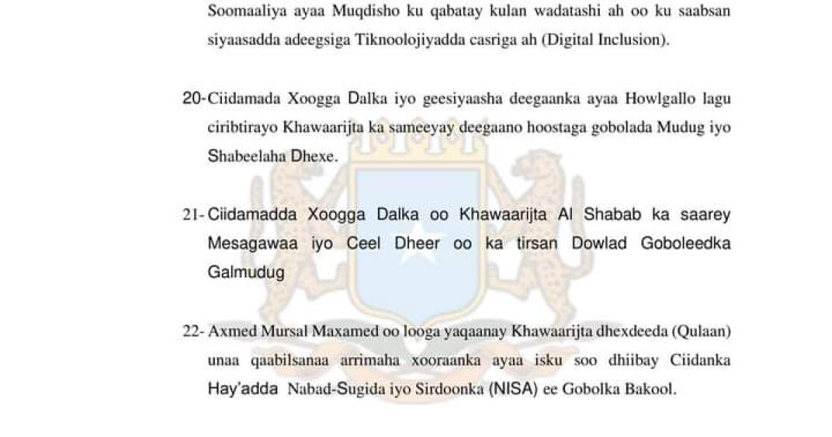 20- Ciidamada Xoogga Dalka iyo geesiyaasha deegaanka ayaa Howlgallo lagu ciribtirayo Khawaarijta ka sameeyay deegaano hoostaga gobolada Mudug iyo Shabeelaha Dhexe.