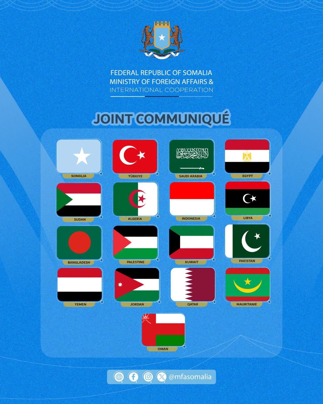 RADIO MUQDISHO:-Wasiirrada Arrimaha Dibadda ee Jamhuuriyadda Federaalka Soomaaliya, Boqortooyada Sacuudi Carabiya, Dowladda Qatar, Jamhuuriyadda Carbeed ee Masar, Jamhuuriyadda Suudaan, Dowladda Liibiya, Jamhuuriyadda Dadka ee Bangladesh, Jamhuuriyadda Dimuqraadiga Dadka ee Aljeeriya, Dowladda Falastiin, Jamhuuriyadda Turkiga, Jamhuuriyadda Indonesia, Jamhuuriyadda Islaamiga ah ee Pakistan, Dowladda Kuwait, Jamhuuriyadda Islaamiga ah ee Mauritania, Boqortooyada Hashimite ee Urdun, Saldanadda Cumaan, Jamhuuriyadda Lubnaan iyo Jamhuuriyadda Yemen, waxay si adag u cambaareynayaan ku dhawaaqista Israa’11l ee magacaabista wakiil diblomaasiyadeed ee waxa loogu yeero “Somaliland”, taas oo loo arko xadgudub cad oo ka dhan ah madax-bannaanida, midnimada iyo wadajirka dhuleed ee Jamhuuriyadda Federaalka Soomaaliya.