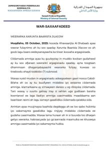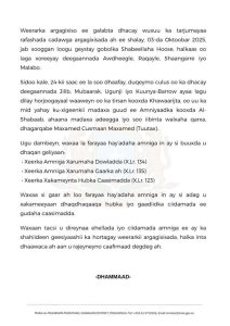 Weerarka argagixiso ee galabta dhacay wuxuu ka tarjumayaa rafashada cadawga argagixisada ah ee shalay, 03-da Oktoobar 2025, jab xooggan loogu geystay gobolka Shabeellaha Hoose, halkaas oo laga xoreeyay deegaannada Awdheegle, Raqayle, Shaangarre iyo Malabo.