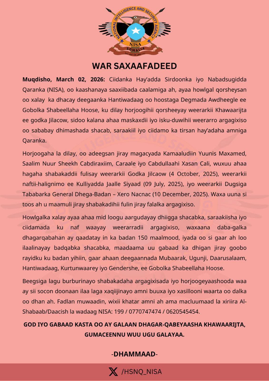 Beegsiga lagu burburinayo shabakadaha argagixisada iyo horjoogeyaashooda waa ay sii socon doonaan ilaa laga xaqiijinayo amni buuxa iyo xasillooni waarta oo dalka oo dhan ah. Fadlan muwaadin, wixii khatar amni ah ama macluumaad la xiriira Al-Shabaab/Daacish la wadaag NISA: 199 / 0770747474 / 0620545454.