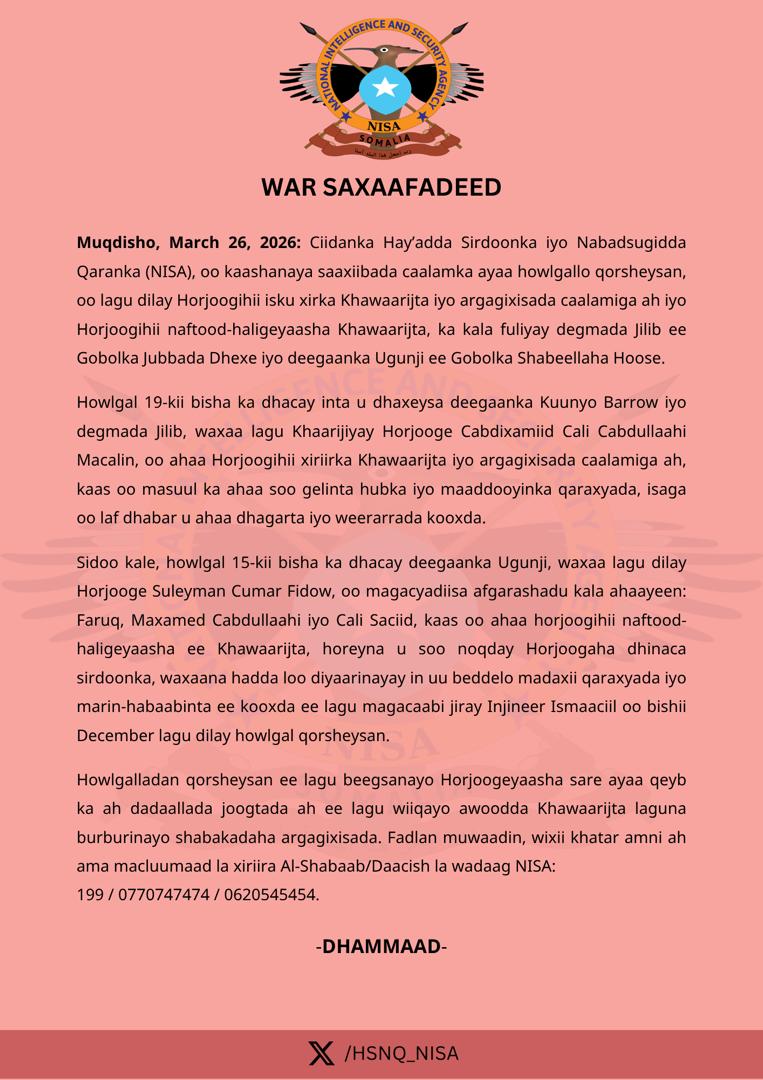 Ciidanka Hay’adda Sirdoonka iyo Nabadsugidda Qaranka (NISA), oo kaashanaya saaxiibada caalamka ayaa howlgallo qorsheysan, oo lagu dilay Horjoogihii isku xirka Khawaarijta iyo argagixisada caalamiga ah iyo Horjoogihii naftood-haligeyaasha Khawaarijta, ka kala fuliyay degmada Jilib ee Gobolka Jubbada Dhexe iyo deegaanka Ugunji ee Gobolka Shabeellaha Hoose.