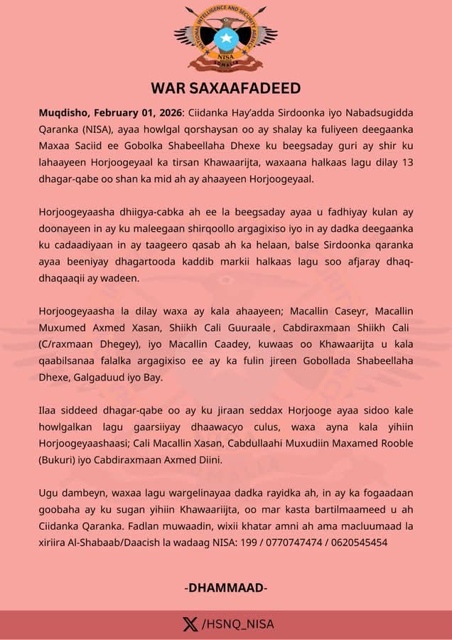 Ciidanka Hay’adda Sirdoonka iyo Nabadsugidda Qaranka (NISA), ayaa howlgal qorshaysan oo ay shalay ka fuliyeen deegaanka Maxaa Saciid ee Gobolka Shabeellaha Dhexe ku beegsaday guri ay shir ku lahaayeen Horjoogeyaal ka tirsan Khawaarijta, waxaana halkaas lagu dilay 13 dhagar-qabe oo shan ka mid ah ay ahaayeen Horjoogeyaal.