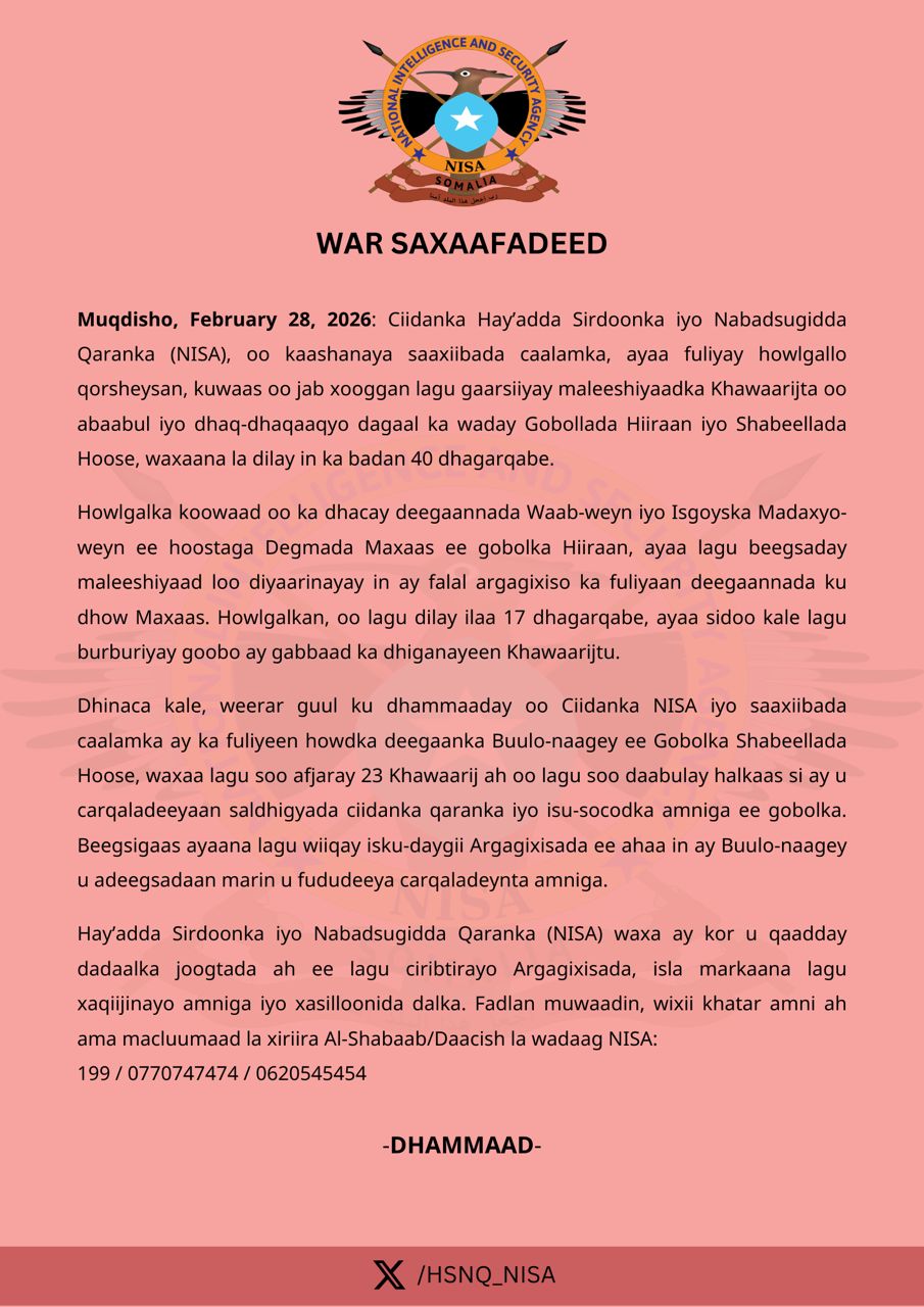 Ciidanka Hay’adda Sirdoonka iyo Nabadsugidda Qaranka (NISA), oo kaashanaya saaxiibada caalamka, ayaa fuliyay howlgallo qorsheysan, kuwaas oo jab xooggan lagu gaarsiiyay maleeshiyaadka Khawaarijta oo abaabul iyo dhaq-dhaqaaqyo dagaal ka waday Gobollada Hiiraan iyo Shabeellada Hoose, waxaana la dilay in ka badan 40 dhagarqabe.