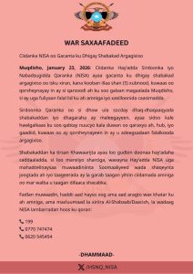 Shabakaddan ka tirsan Khawaarijta ayaa loo gudbin doonaa hay’adaha caddaaladda, si loo marsiiyo sharciga, waxayna Hay’adda NISA uga mahadcelinaysaa muwaadiniinta Soomaaliyeed wada shaqeynta joogtada ah iyo taageerada ay la garab taagan yihiin ciidamada amniga oo mar walba u taagan difaaca shacabka.
