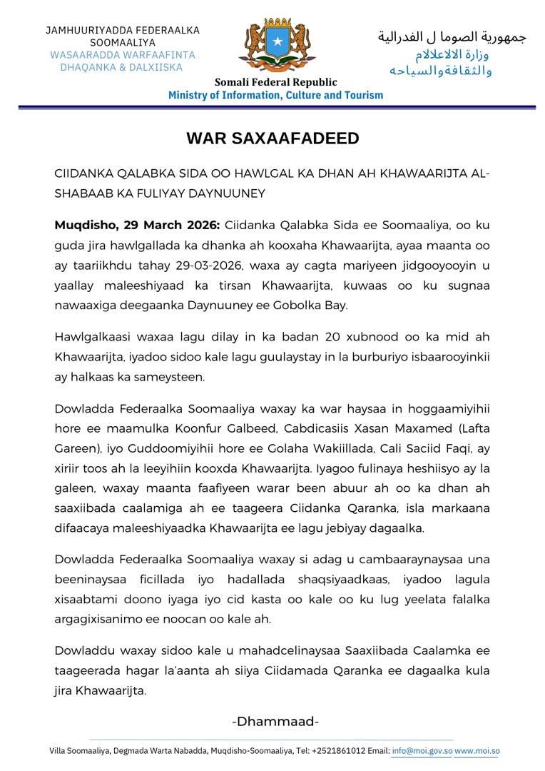 Ciidanka Qalabka Sida ee Soomaaliya, oo ku guda jira hawlgallada ka dhanka ah kooxaha Khawaarijta, ayaa maanta oo ay taariikhdu tahay 29-03-2026, waxa ay cagta mariyeen jidgooyooyin u yaallay maleeshiyaad ka tirsan Khawaarijta, kuwaas oo ku sugnaa nawaaxiga deegaanka Daynuuney ee Gobolka Bay.