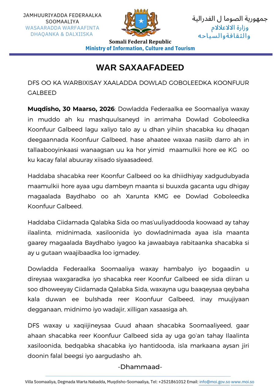 Dowladda Federaalka Soomaaliya waxay hambalyo iyo bogaadin u direysaa waxgaradka iyo shacabka reer Koonfur Galbeed ee sida diiran u soo dhoweeyay Ciidamada Qalabka Sida, waxayna ugu baaqeysaa qeybaha kala duwan ee bulshada reer Koonfuur Galbeed, inay muujiyaan degganaan, midnimo iyo wadajir, xilligan xasaasiga ah.
