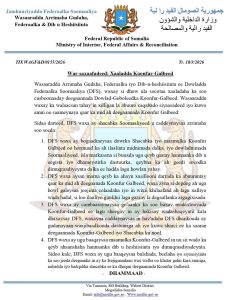 3. DFS waxa ay cambaaraynaysaa go’aanka ka soo baxay madaxtooyada Koonfur-Galbeed ee lagu sheegay in ay hakisay wadashaqeyntii kala dhaxaysay DFS, waxayna caddaynaysaa in hay’adaha DFS dhankooda ay gudanayaan waajibaadkooda dastuuriga ah iyo kuwa sharci ee ka saaran deegaannada Koonfur-Galbeed iyo Shacabka ku nool.