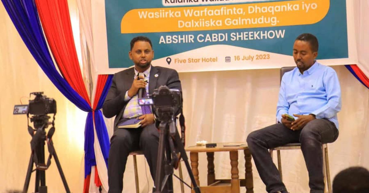 Wasiirka Wasaaradda Warfaafinta Galmudug Abshir Cabdi shèekhoow,Ayaa ugu horreyn sharaxaad buuxda ka siiyay ka qeyb galayaashii Dood Wadaaga, ujeedka laga leeyahay dood wadaaga ku saabsan Dowlad wanaaga iyo isla xisaabtanka taas oo loo marayo Warbaahinta.