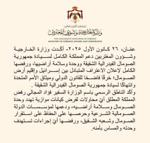 Warsaxaafadeed kasoo baxay Wasaaradda Arrimaha Dibadda ee Boqortooyada Jordan ayaa lagu sheegay in dowladda Jordan ay si adag uga soo horjeeddo ku dhawaaqista Israa’iil ee aqoonsi ku sheega Maamulka Somaliland. Jordan waxay tallaabadaas ku tilmaantay mid si cad u jebinaysa sharciga caalamiga ah iyo Axdiga Qaramada Midoobay, isla markaana xadgudub ku ah madax-bannaanida, midnimada iyo wadajirka dhuleed ee Jamhuuriyadda Federaalka Soomaaliya.