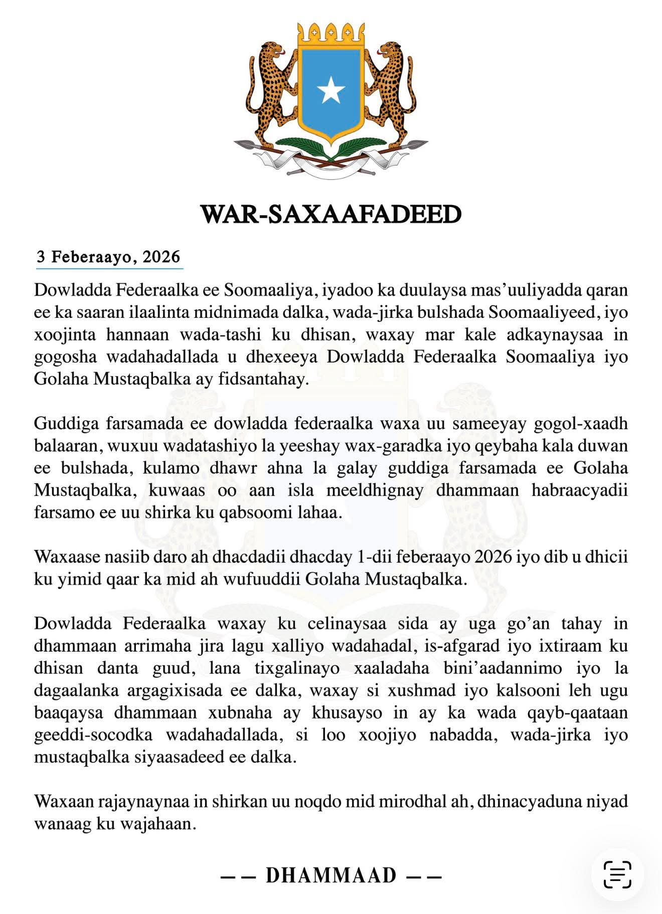 Dowladda Soomaaliya War-saxaafadeed ay soo saartay markale ku celisay inay ahmiyad siineyso wada-hadal Qaran