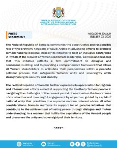 Jamhuuriyadda Federaalka Soomaaliya waxay bogaadinaysaa doorka masuuliyadeed ee wax-ku-oolka ah ee Boqortooyada Sacuudiga, ay ka qaadanayso horumarinta dadaallada lagu xoojinayo wada-hadalka qaran ee Yemen, gaar ahaan hindisaha ay martigelinayso shir ballaaran oo ka dhacaya Riyaad, kaas oo ku yimid codsi ka yimid hoggaanka sharciga ah ee Jamhuuriyadda Yemen.