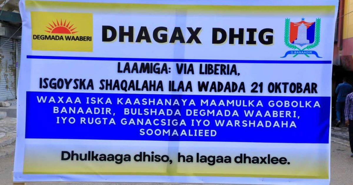Guddoomiyaha Gobolka Banaadir ahna Duqa Miqdisho Mudane Yuusuf Xuseen Jimcaale (Madaale), ayaa dhagax-dhigay Laamiga Via Liberia ee isku xira Isgoyska Shaqaalaha iyo Waddada 21 Oktoobar ee degmada Waaberi, kaas oo muhiim u ah isu socodka bulshada iyo ganacsiga Caasimadda.