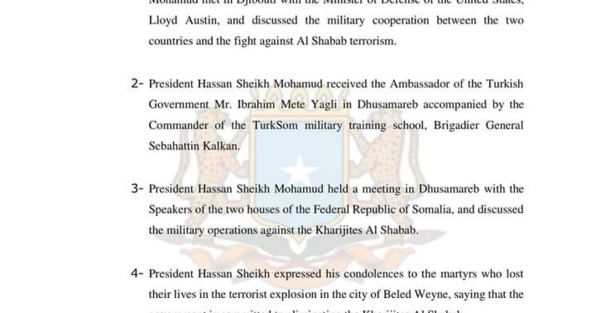 4- President Hassan Sheikh expressed his condolences to the martyrs who lost their lives in the terrorist explosion in the city of Beled Weyne, saying that the government is committed to eliminating the Kharijites Al Shabab.