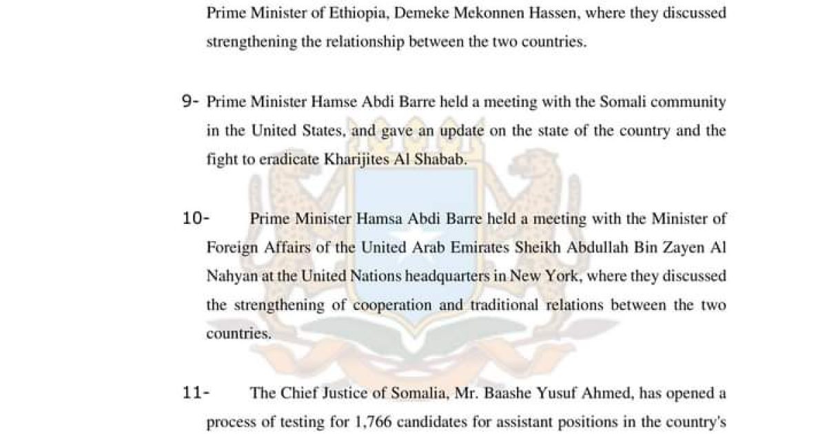 8- Prime Minister Hamsa Abdi Barre had a meeting in New York with the Deputy Prime Minister of Ethiopia, Demeke Mekonnen Hassen, where they discussed strengthening the relationship between the two countries.