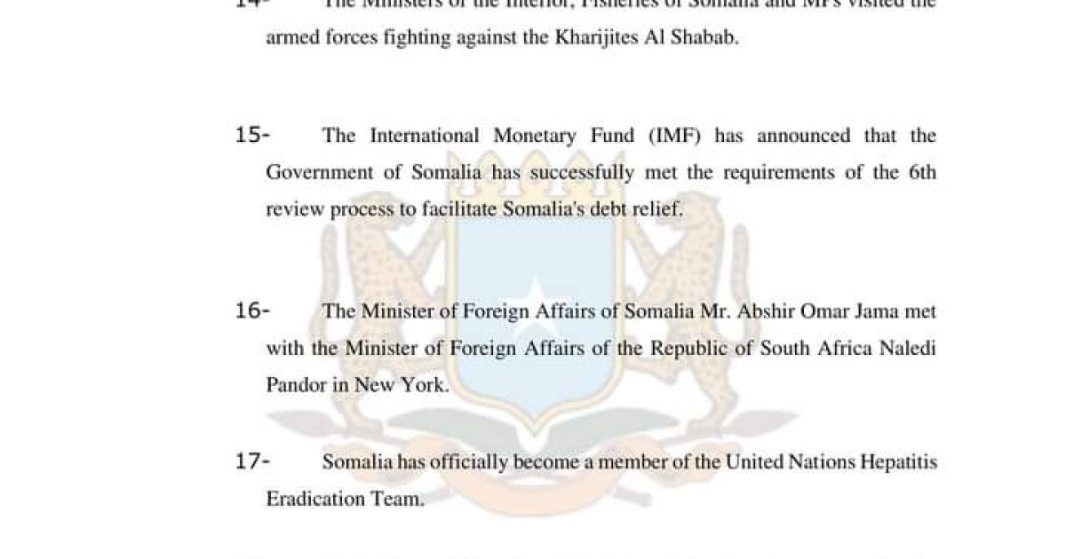 15- The International Monetary Fund (IMF) has announced that the Government of Somalia has successfully met the requirements of the 6th review process to facilitate Somalia’s debt relief.
