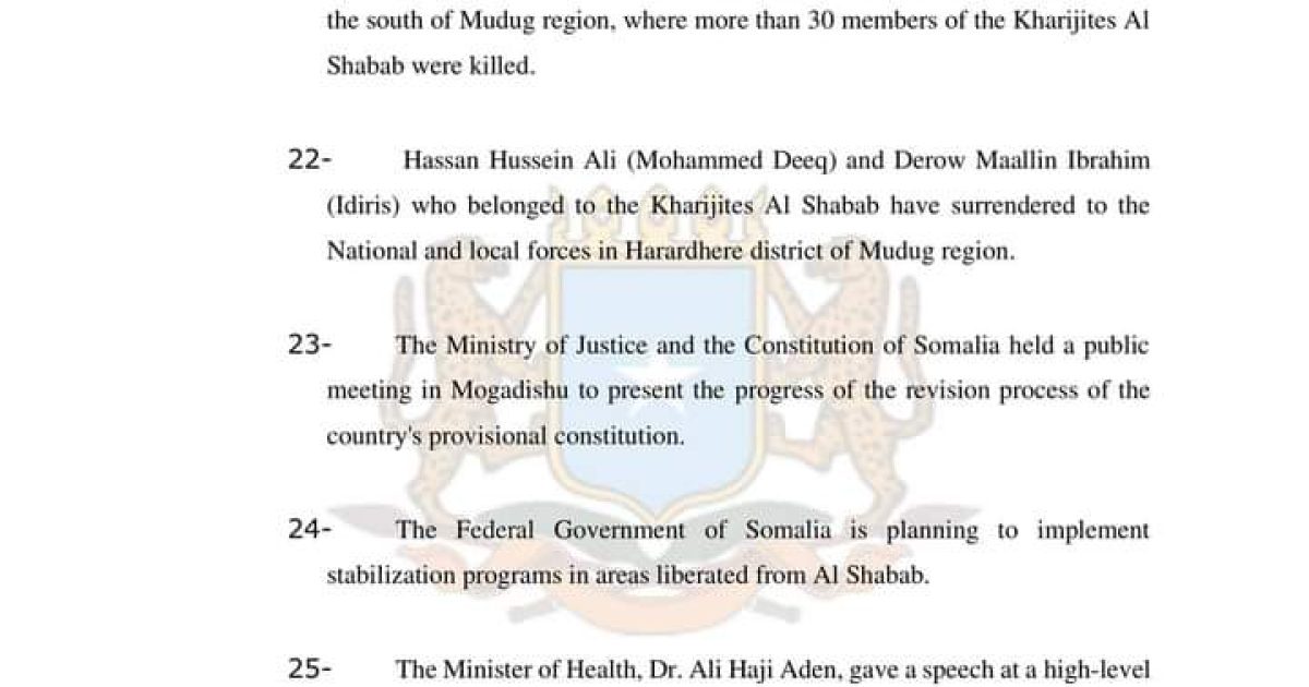 3- President Hassan Sheikh Mohamud held a meeting in Dhusamareb with the Speakers of the two houses of the Federal Republic of Somalia, and discussed the military operations against the Kharijites Al Shabab.