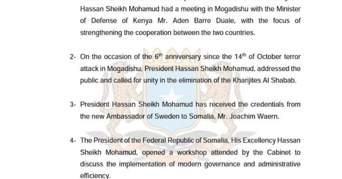 6- President Hassan Sheikh Mohamud presided over the weekly cabinet meeting and gave brief on the progress made in the war against the Kharijites and other crucial political programs in the country.