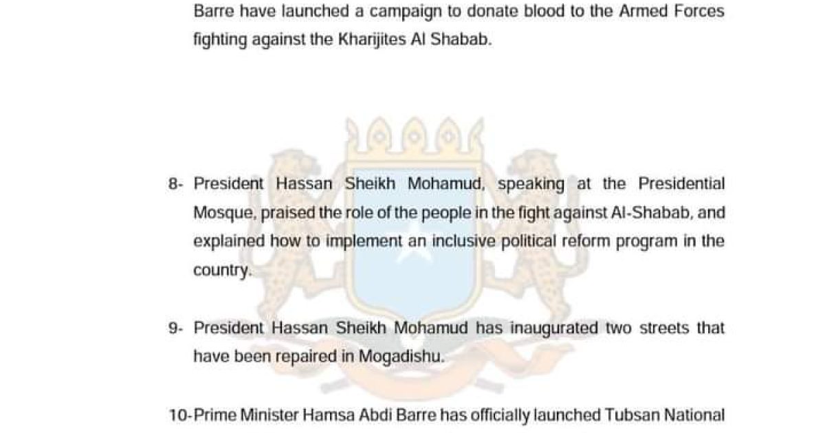 10- Prime Minister Hamsa Abdi Barre has officially launched Tubsan National Center for Preventing and Countering Violent Extremism.