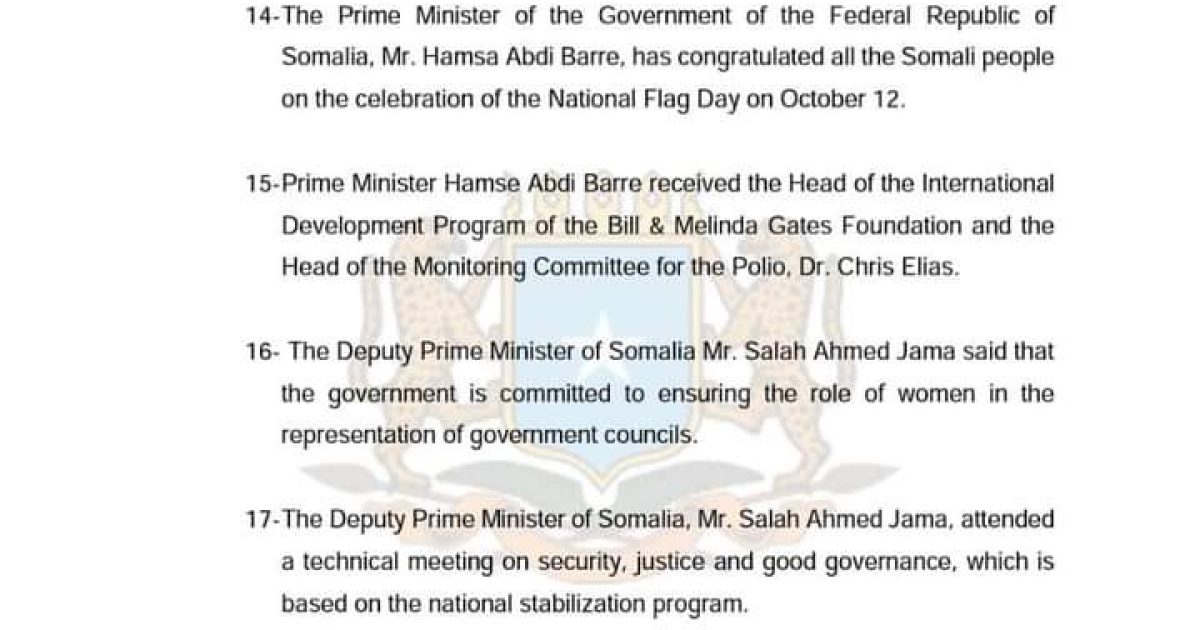 14- The Prime Minister of the Government of the Federal Republic of Somalia, Mr. Hamsa Abdi Barre, has congratulated all the Somali people on the celebration of the National Flag Day on October 12.