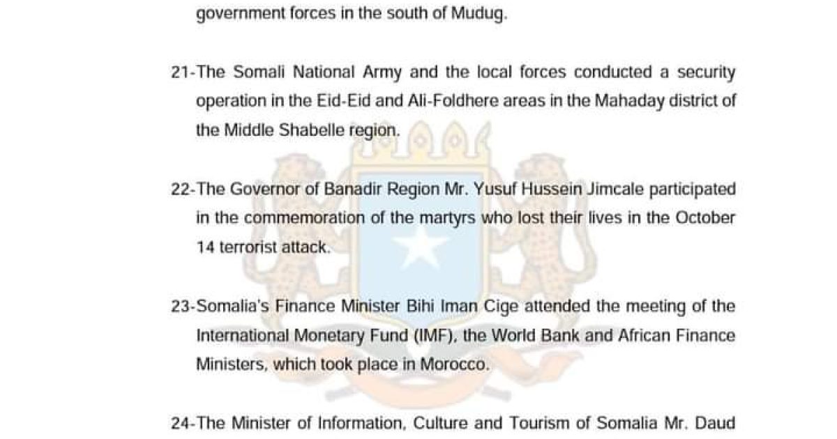 23- Somalia’s Finance Minister Bihi Iman Cige attended the meeting of the International Monetary Fund (IMF), the World Bank and African Finance Ministers, which took place in Morocco.