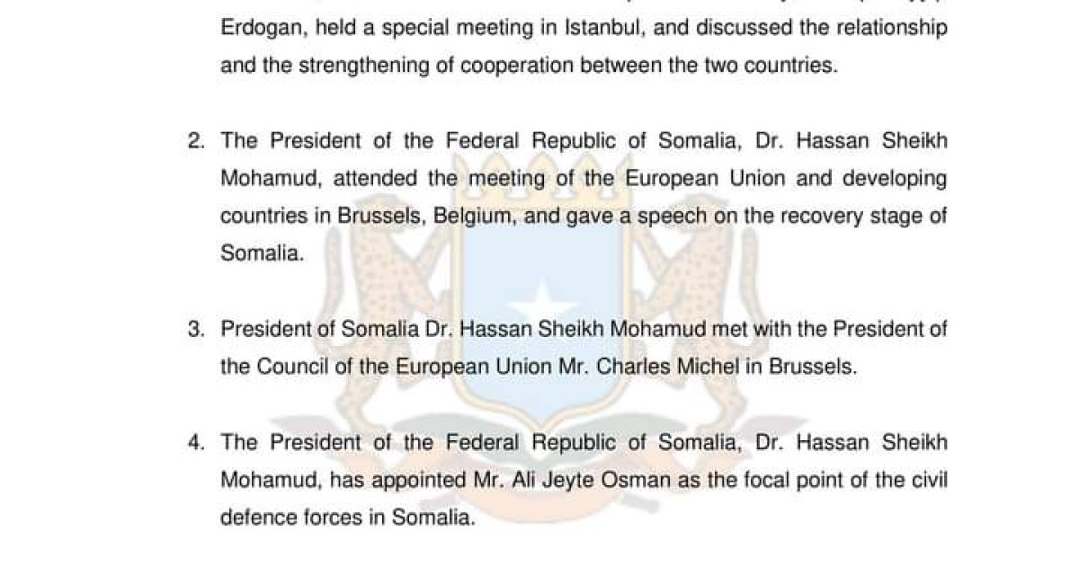 3. President of Somalia Dr. Hassan Sheikh Mohamud met with the President of the Council of the European Union Mr. Charles Michel in Brussels.