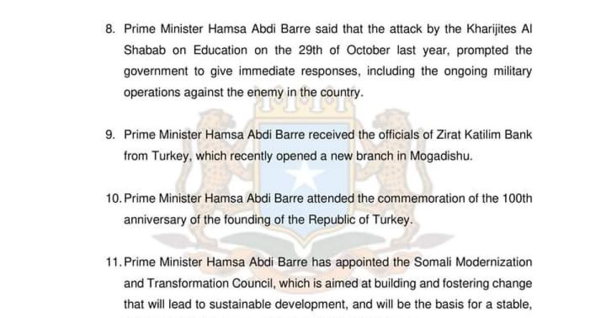 11. Prime Minister Hamsa Abdi Barre has appointed the Somali Modernization and Transformation Council, which is aimed at building and fostering change that will lead to sustainable development, and will be the basis for a stable, efficient administration, and financial stability in Somalia.