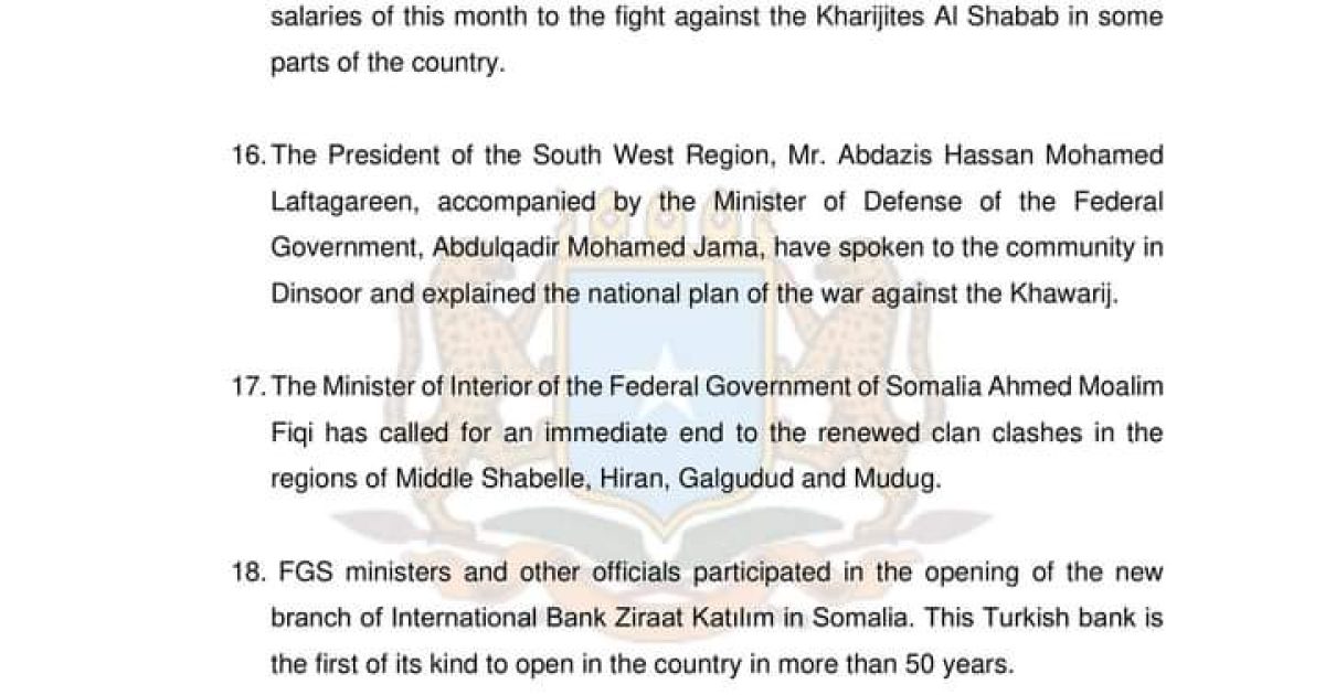 15. The Cabinet of the Federal Government of Somalia has donated their salaries of this month to the fight against the Kharijites Al Shabab in some parts of the country.