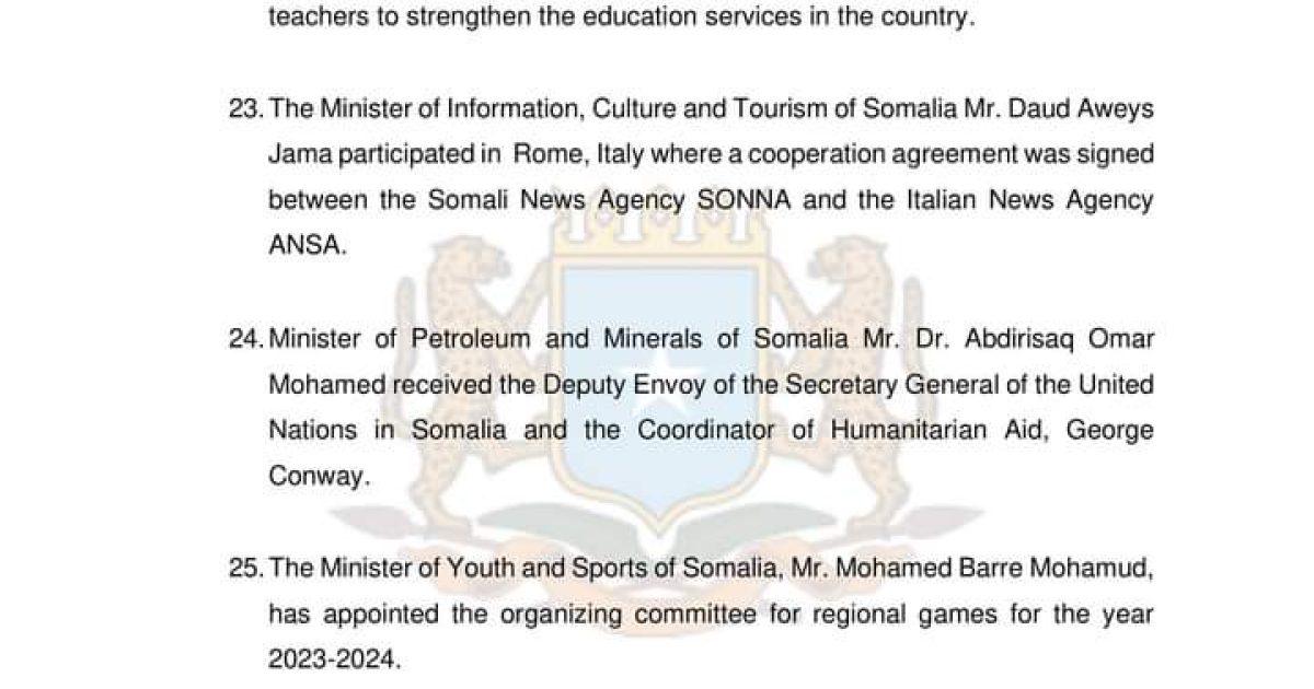 23. The Minister of Information, Culture and Tourism of Somalia Mr. Daud Aweys Jama participated in Rome, Italy where a cooperation agreement was signed between the Somali News Agency SONNA and the Italian News Agency ANSA.