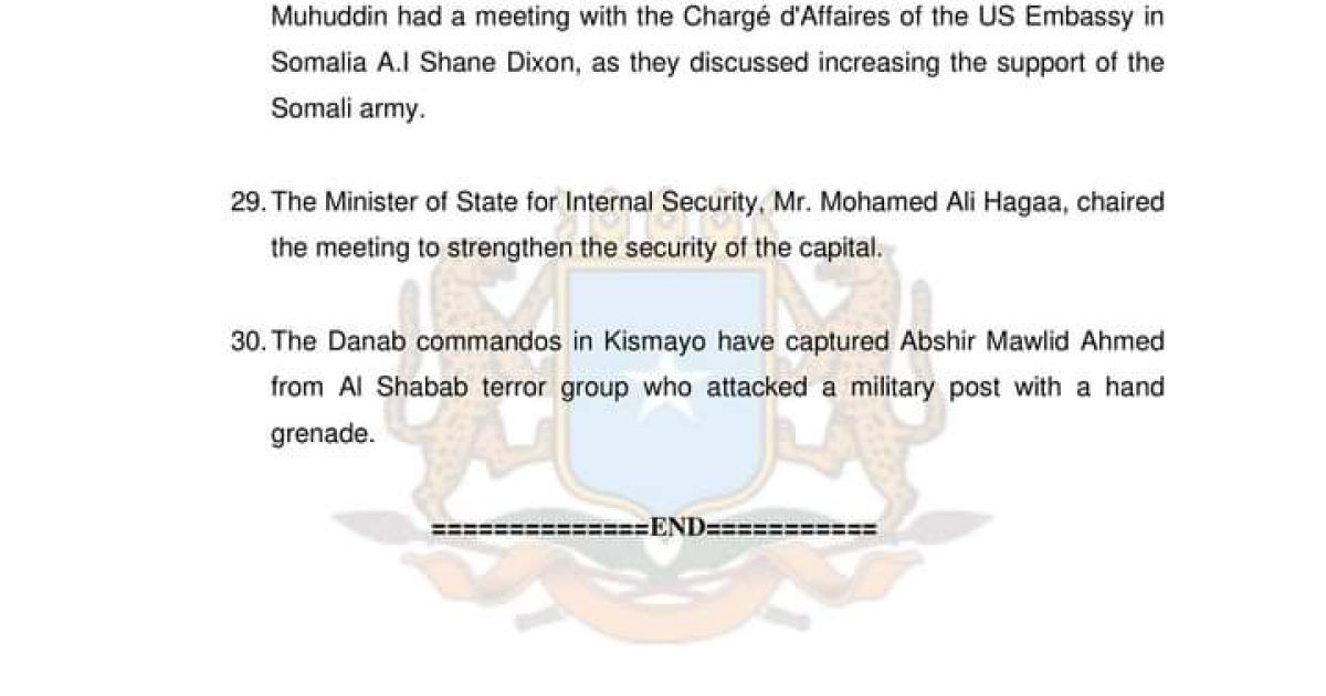 28. The Commander of the Somali National Army General Ibrahim Sheikh Muhuddin had a meeting with the Chargé d’Affaires of the US Embassy in Somalia A.I Shane Dixon, as they discussed increasing the support of the Somali army.
