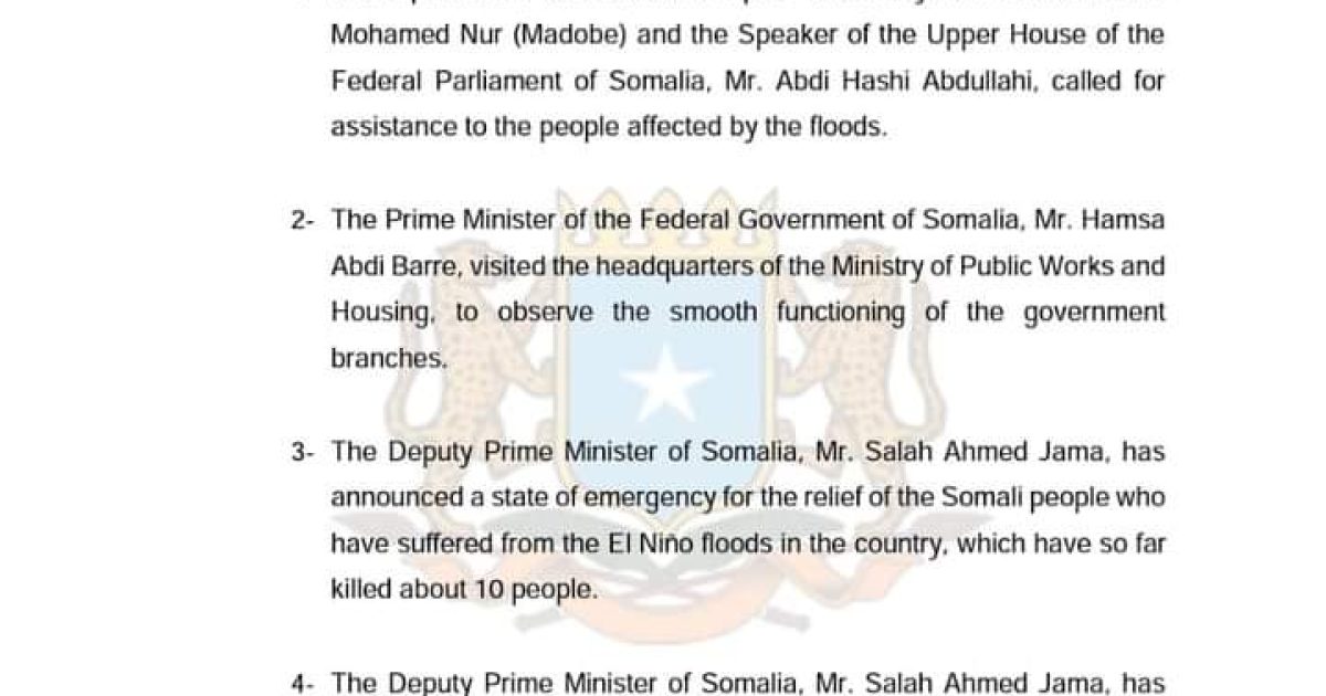 3- The Deputy Prime Minister of Somalia, Mr. Salah Ahmed Jama, has announced a state of emergency for the relief of the Somali people who have suffered from the El Niño floods in the country, which have so far killed about 10 people.