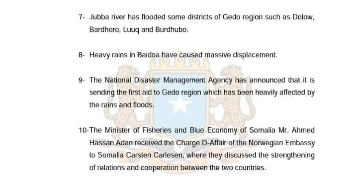 9- The National Disaster Management Agency has announced that it is sending the first aid to Gedo region which has been heavily affected by the rains and floods.