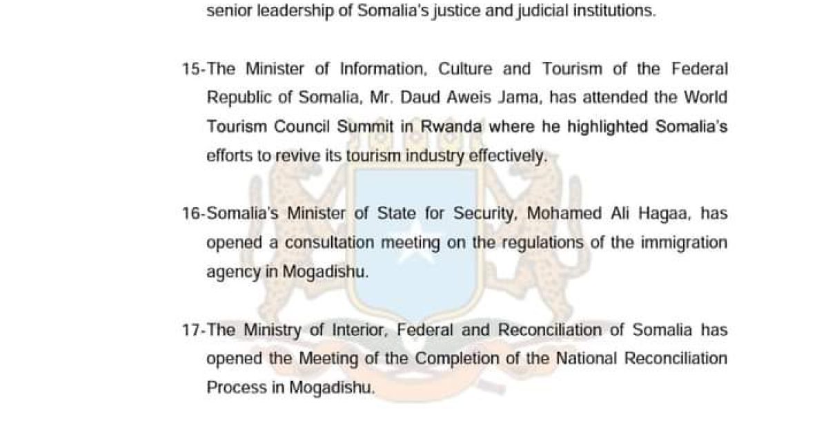 17- The Ministry of Interior, Federal and Reconciliation of Somalia has opened the Meeting of the Completion of the National Reconciliation Process in Mogadishu.