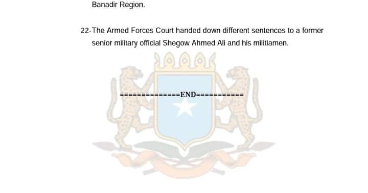 22- The Armed Forces Court handed down different sentences to a former senior military official Shegow Ahmed Ali and his militiamen.