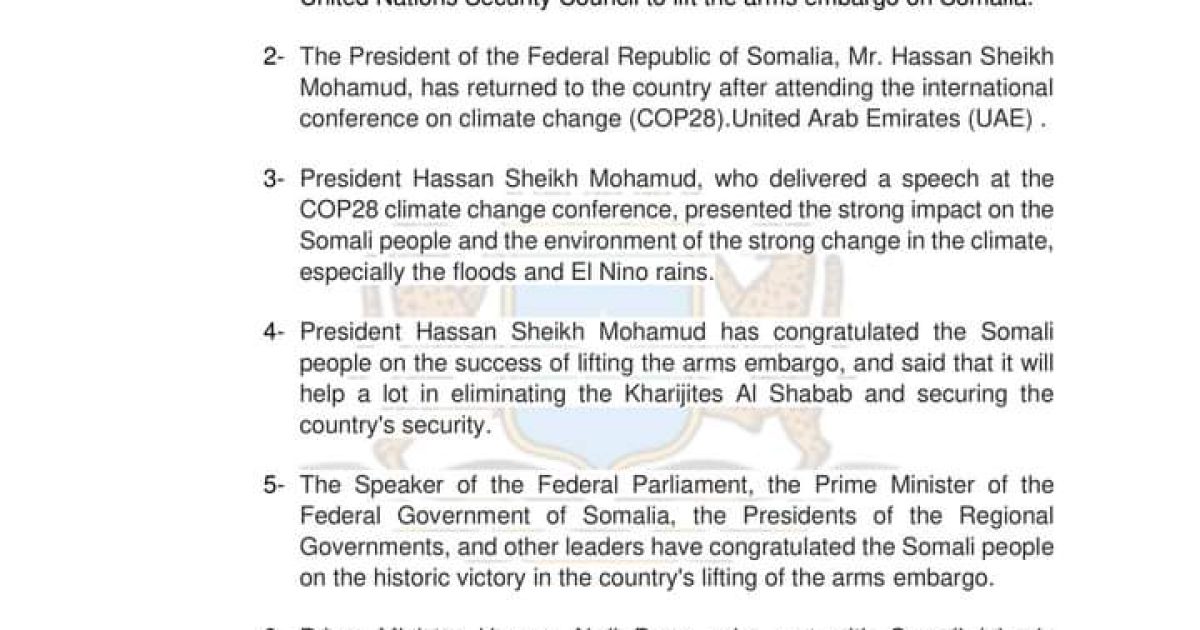 5- The Speaker of the Federal Parliament, the Prime Minister of the Federal Government of Somalia, the Presidents of the Regional Governments, and other leaders have congratulated the Somali people on the historic victory in the country’s lifting of the arms embargo.