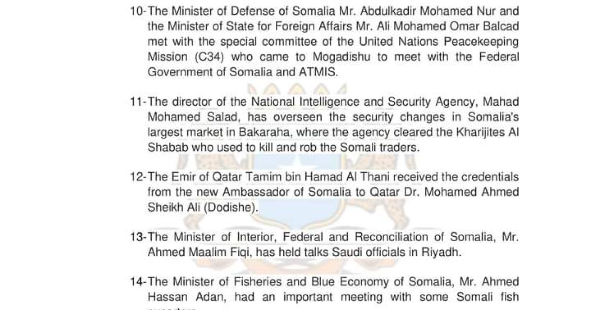10- The Minister of Defense of Somalia Mr. Abdulkadir Mohamed Nur and the Minister of State for Foreign Affairs Mr. Ali Mohamed Omar Balcad met with the special committee of the United Nations Peacekeeping Mission (C34) who came to Mogadishu to meet with the Federal Government of Somalia and ATMIS.
