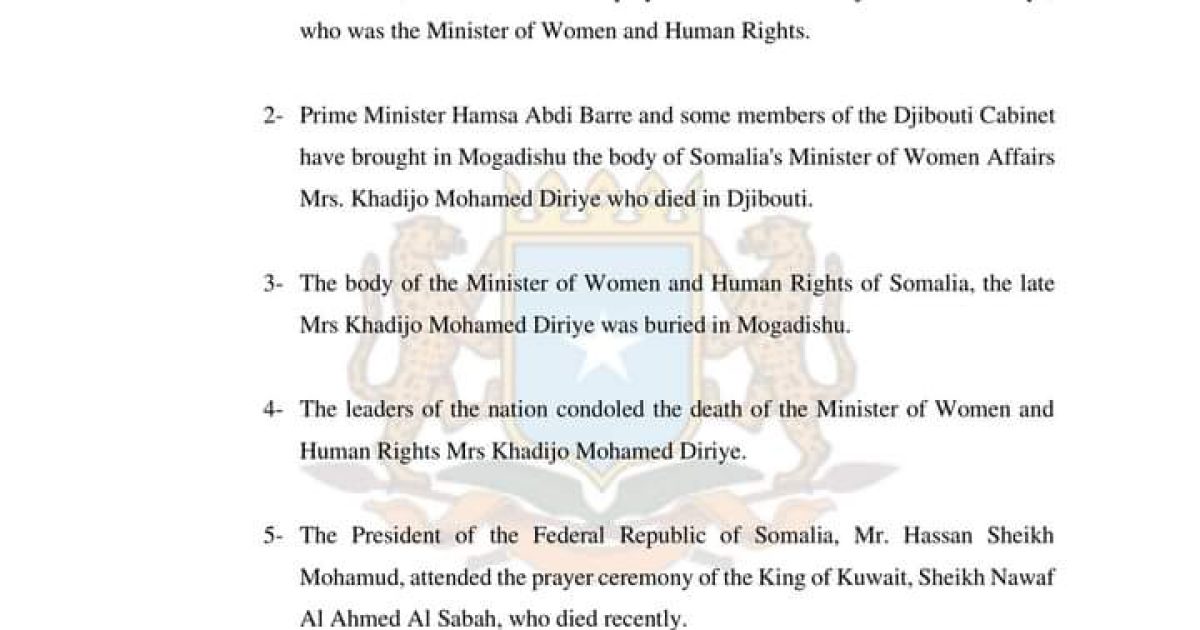 4- The leaders of the nation condoled the death of the Minister of Women and Human Rights Mrs Khadijo Mohamed Diriye.
